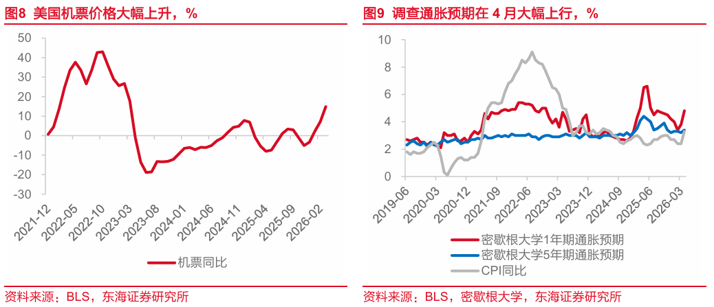 核心商品价格或因需求承压影响而保持稳定。核心商品价格3月环比增速保持在0.1%,同比略微升高至1.2%,前值1.0%。服饰价格增速出现边际收敛的迹象,环比由前值1.8%下降至1.1%,同比由2.5%升高至3.4%。新车价格依然保持稳定,环比价格增速小幅上行至0.1%,或显示关税传递效应正在逐渐减弱。二手车价格增速维持在低位-0.4%不变,不过曼海姆二手车价格指数显示后续依然或有上行压力。整体来看,3月能源价格的上行并没有立即传导至核心商品上。我们认为原因其一是能源通胀传导至商品端具有时滞性;其二是能源通胀对于消费的反身性,即高通胀预期反而压制消费和投资行为,从而弱化其对核心通胀的影响,这一点从3月初略有走弱的红皮书商品销售情况亦能反映。同时,由于密歇根大学调查统计的消费者通胀预期(初值)在4月存在明显升温迹象,我们认为4月美国或依然出现需求对价格承接乏力的情况。