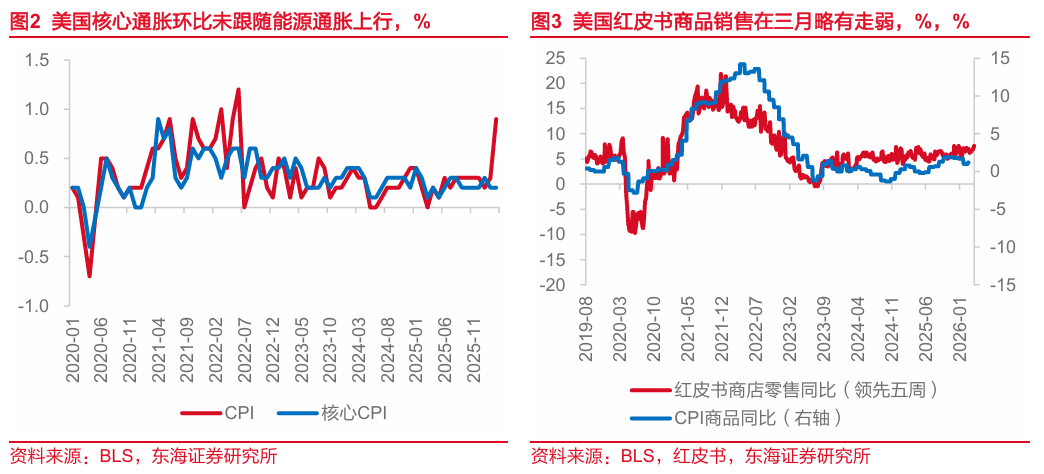 核心观点:美国3月整体通胀数据在市场预期内上行,汽油价格的上涨是当月通胀的主要贡献项,但能源价格的上行并没有立即传导至核心通胀上。我们认为原因其一是能源通胀传导至商品端具有时滞性;其二是能源通胀对于消费端的“反身性”,即高通胀预期反而压制消费和投资行为,从而弱化其对核心通胀的影响,这一点从3月初略有走弱的红皮书商品销售情况亦能反映。后续来看,我们认为受中东冲突缓和影响,油价短期继续上行空间较小,对美国后续整体通胀推升较为有限。同时,由于密歇根大学调查统计的消费者通胀预期(初值)在4月存在明显升温迹象,我们认为4月美国或依然出现需求对价格承接乏力的情况。但就住房价格方面需要注意到的一点是,2025年10月租金采集的空缺导致价格指数存在显著低估,而半年轮换采样机制使得2026年4月住房价格增速或存在补偿性升高情况,或对美国通胀有一定技术性的上行压力。整体来看,美国3月通胀符合预期,核心通胀依然保持温和,市场小幅加强美联储年内降息的可能性。我们维持美联储上半年按兵不动的观点,下半年沃什上任美联储主席叠加特朗普中期选举的政治诉求或为美国带来降息机会。