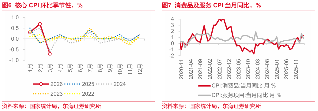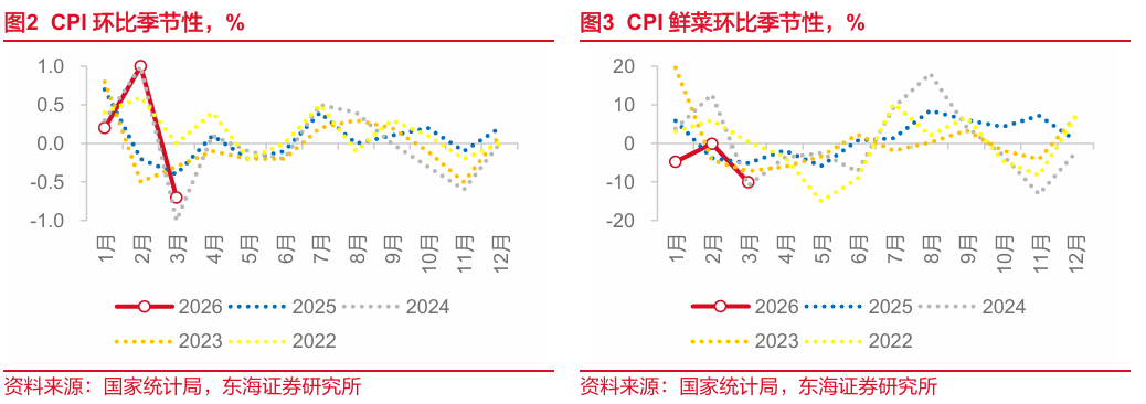 CPI环比基本符合季节性。CPI在春节后当月通常会环比负增长,今年也符合这一季节性规律。而与同样春节较晚的2015年、2018年、2021年、2024年相比较,3月环比-0.7%也基本符合积极性(以上4年同期均值-0.79%)。